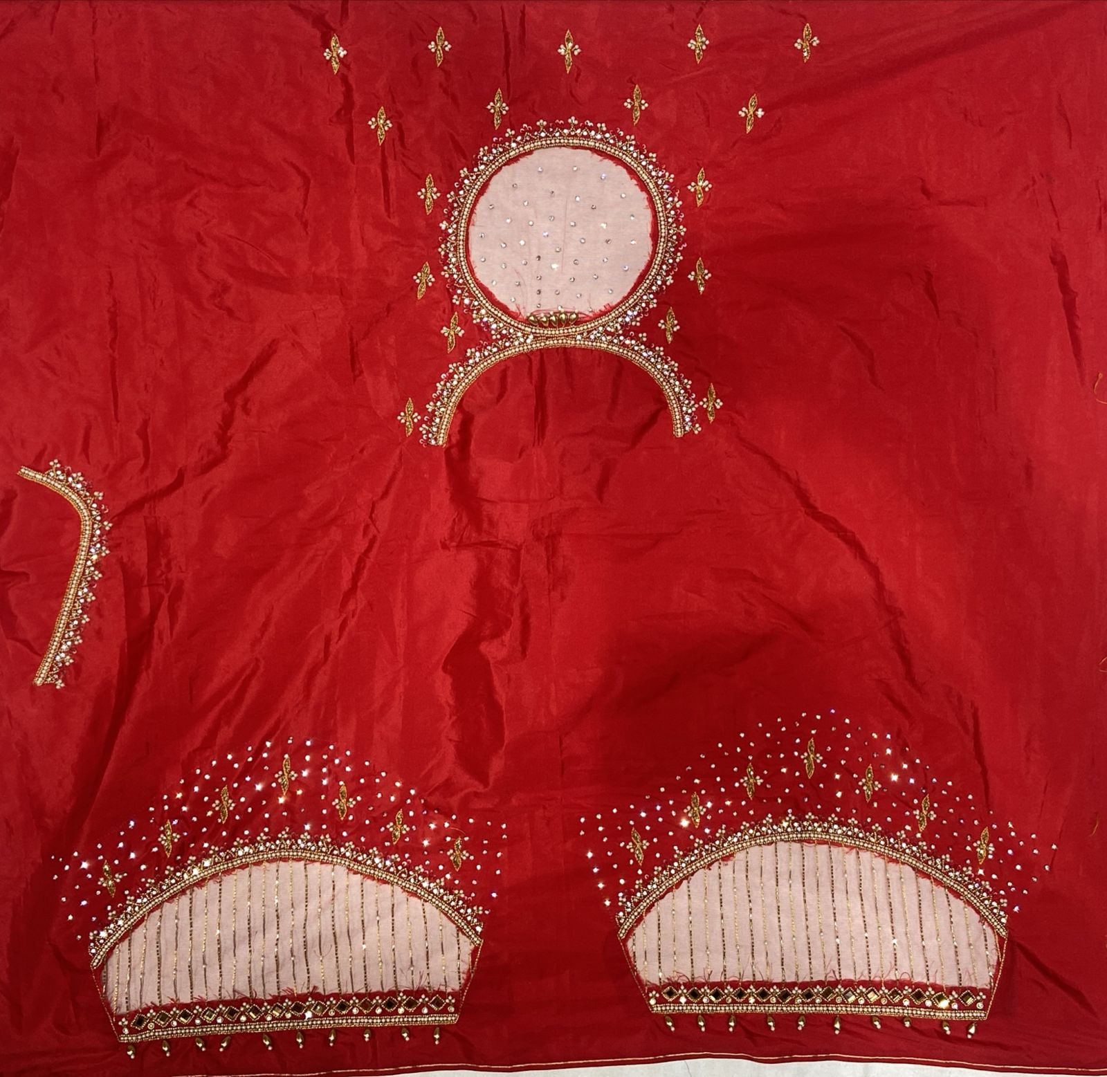 This elegant blouse features a boat neck design beautifully embellished with intricate hand embroidery around the neckline, adding a touch of traditional charm. The sleeves are crafted from sheer net fabric, giving a soft, graceful look while enhancing the overall style. Perfect for festive and special occasions, this blouse blends simplicity with sophistication, making it an ideal choice for silk and designer sarees.